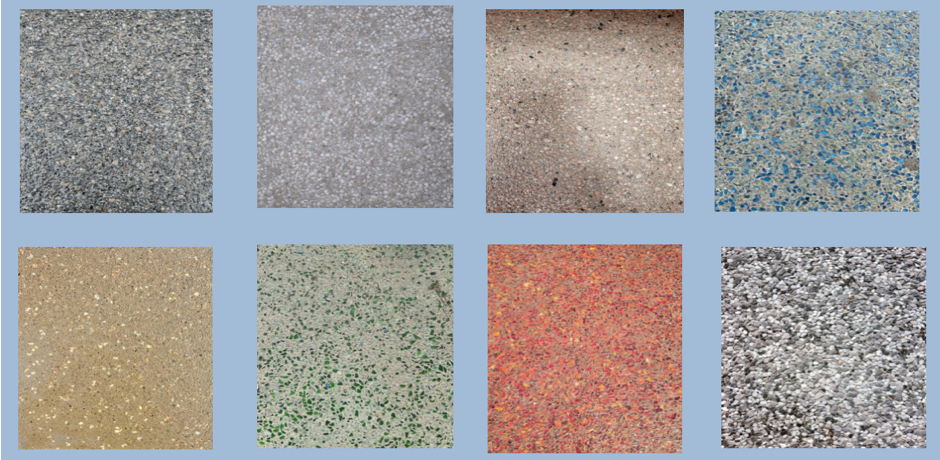 彩色的混凝土搭配天然骨料可以呈现具有自然属性的质感,也可搭配金属骨料、陶瓷骨料、玻璃骨料等人造骨料营造更加丰富的装饰效果。色彩的多样选择性也使铺装效果具备了广泛的创意选择空间。